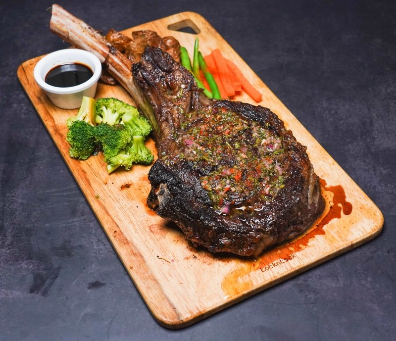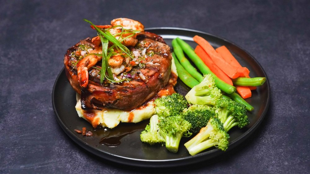 Round cut tenderloin wrapped with bacon and topped w/ shrimps.