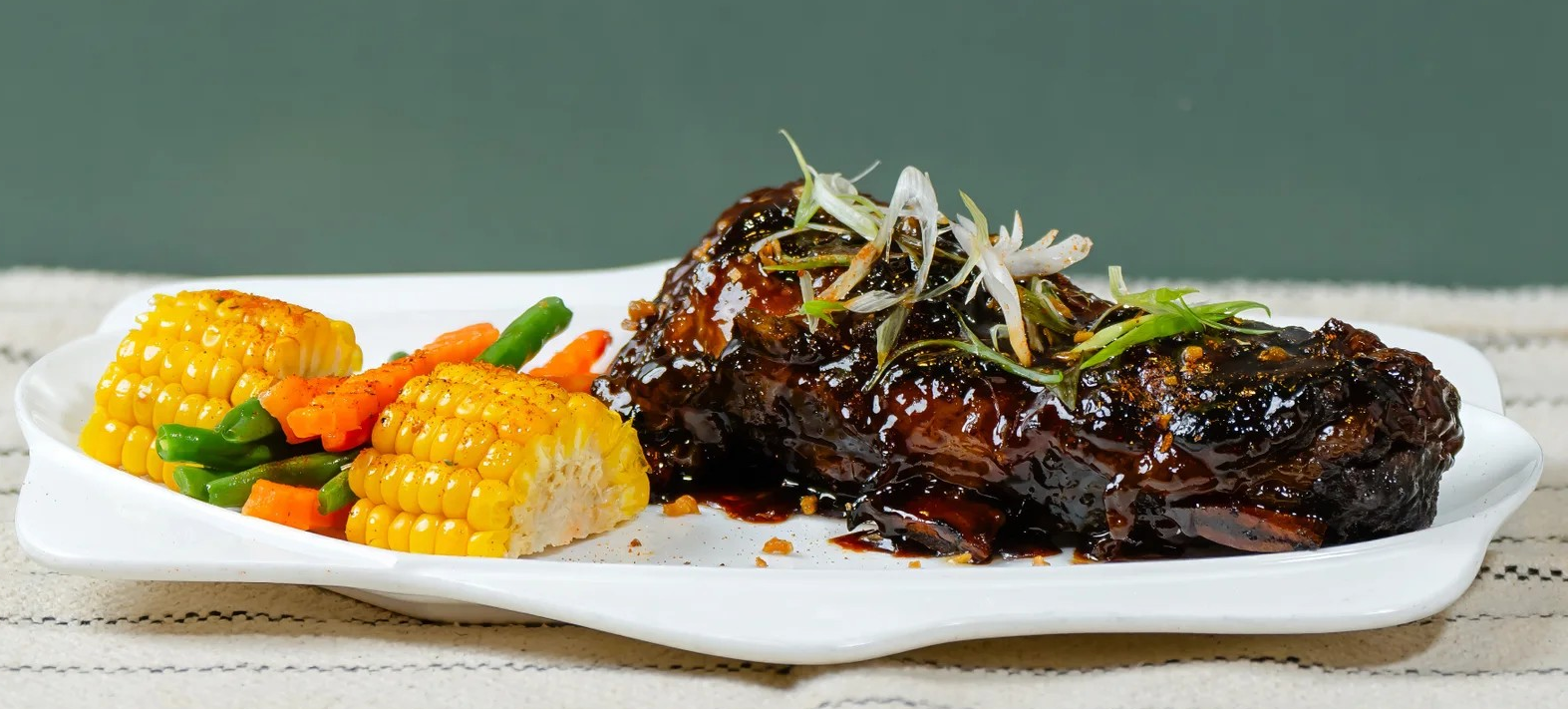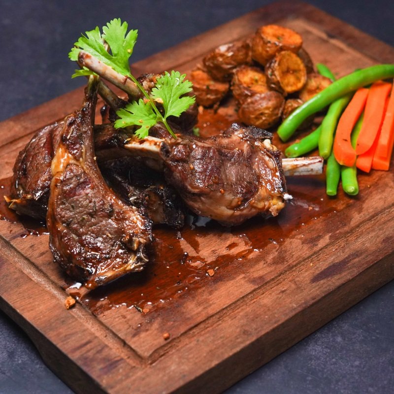 Grilled lamb chops seasoned with herbs & spices. Balsamic reduction on the side.