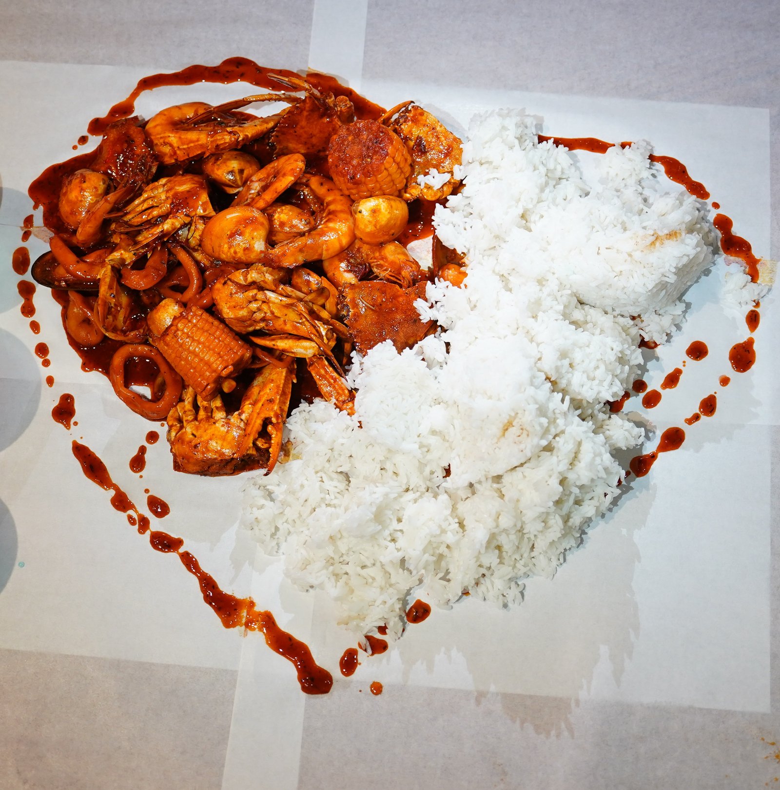 Good for 2-4 pax. This set includes shrimp, squid, mussel, clam, crab, corn, and comes with unlimited rice and iced tea.