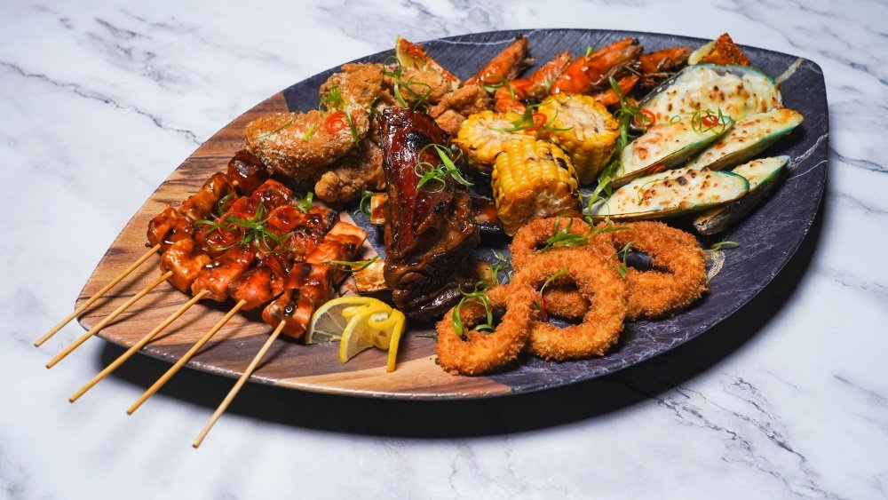 Good for 2-3 pax. This set includes BBQ Beef ribs, grilled chicken wings, grilled squid, grilled mussel, fried calamari, shrimp & salmon skewers and comes with unlimited rice and iced tea.