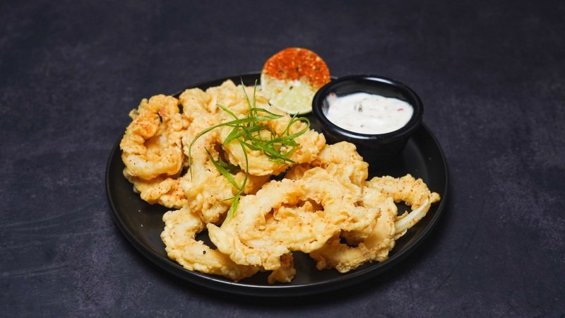 Crispy battered squid served with tartar sauce.